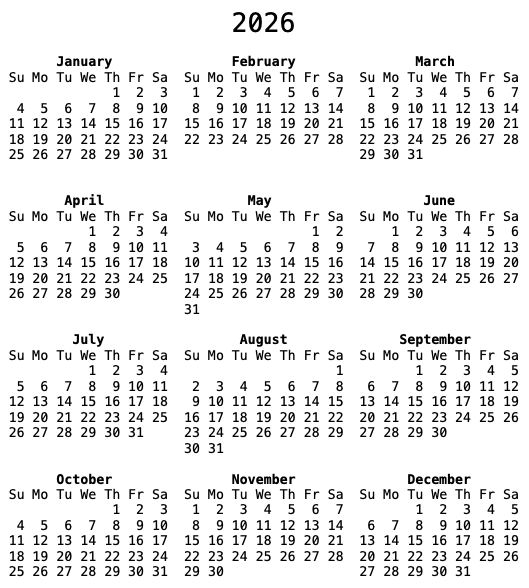 The year’s calendar corresponding to the year you entered will be output to the screen. This will work for virtually any past or future year (year 1 to 9999).